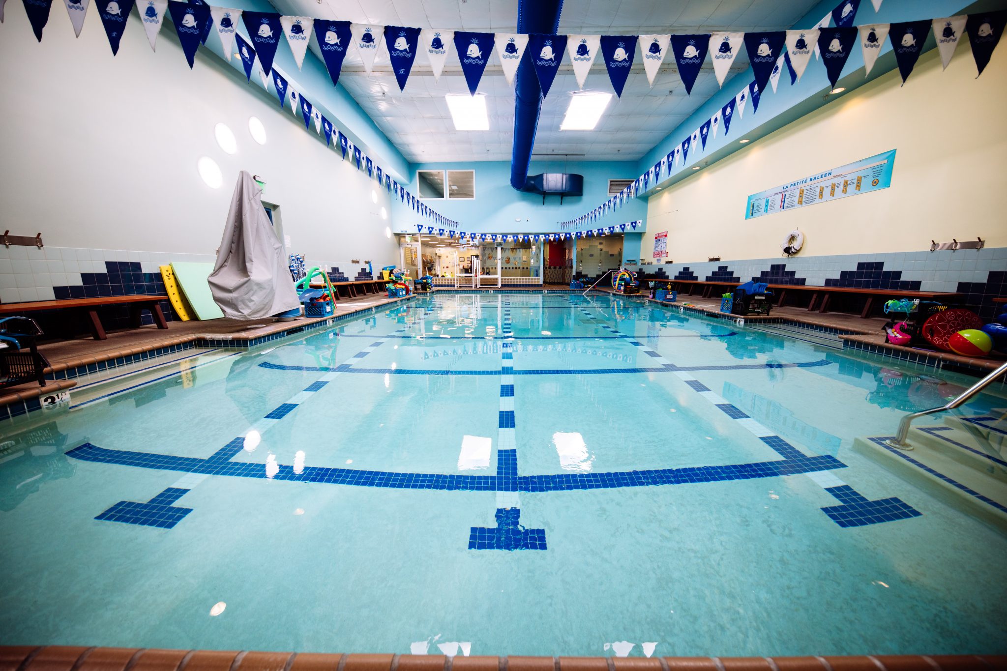 Opened in 2008, La Petite Baleen’s largest facility is located on Crissy Field, in the historic Presidio district of San Francisco, CA. We have two indoor pools heated to 90 degrees. Our baby pool is 20′ x 40′ feet, and our large pool is 30′ x 60′ feet. Our San Francisco swim school offers up to 11 classes at a time on both the half and quarter-hour. There’s a large on-deck rinse-off area, separate changing areas, and private changing stalls, as well as on-deck and off-deck viewing for spectators. We pride ourselves on teaching children and adults of all ages with the swim classes San Francisco Bay Area residents enjoy.